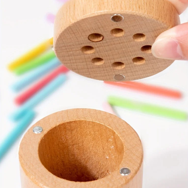 Votre enfant pourra s'amuser à insérer les bâtonnets dans les trous de la même couleur, apprenant ainsi à se familiariser avec les différentes couleurs.